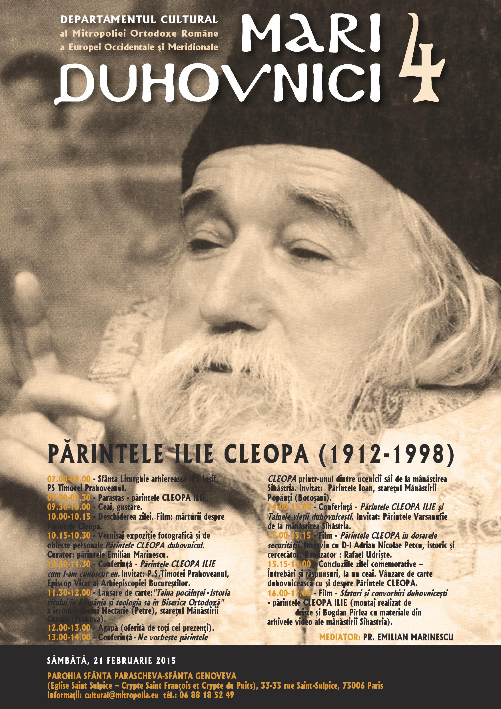 Cea de-a patra întâlnire de acest gen se va desfăşura sâmbătă 21 februarie 2015 şi va fi dedicată Părintelui CLEOPA ILIE. Înaltpreasfinţitul Iosif, gazda evenimentului, va avea ca invitaţi doi dintre ucenicii părintelui Cleopa, vieţuitori ai mânăstirii Sihăstria, locul unde părintele a trecut la cele veşnice şi este înmormântat. După cum ne spune Preafericitul Părinte Patriarh Daniel, « Părintele Cleopa Ilie, luminător de suflete pe calea mântuirii », a fost unul dintre cei mai mari duhovnici şi stareţi ai României; iar Înaltpreasfinţitul Părinte Mitropolit Teofan completează: « A fost un om al ascezei, al trezviei, al rugăciunii inimii, dar şi om al slujirii semenilor săi cu durere şi cu dragoste».